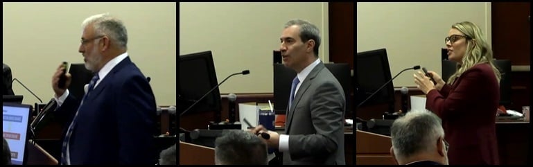 From left, attorneys Wes Holmes, Jose Isasi II, and Jennifer Weizenecker deliver openings at trial against R.J. Reynolds over the laryngeal cancer death of a New Mexico man. Watch the trial.
